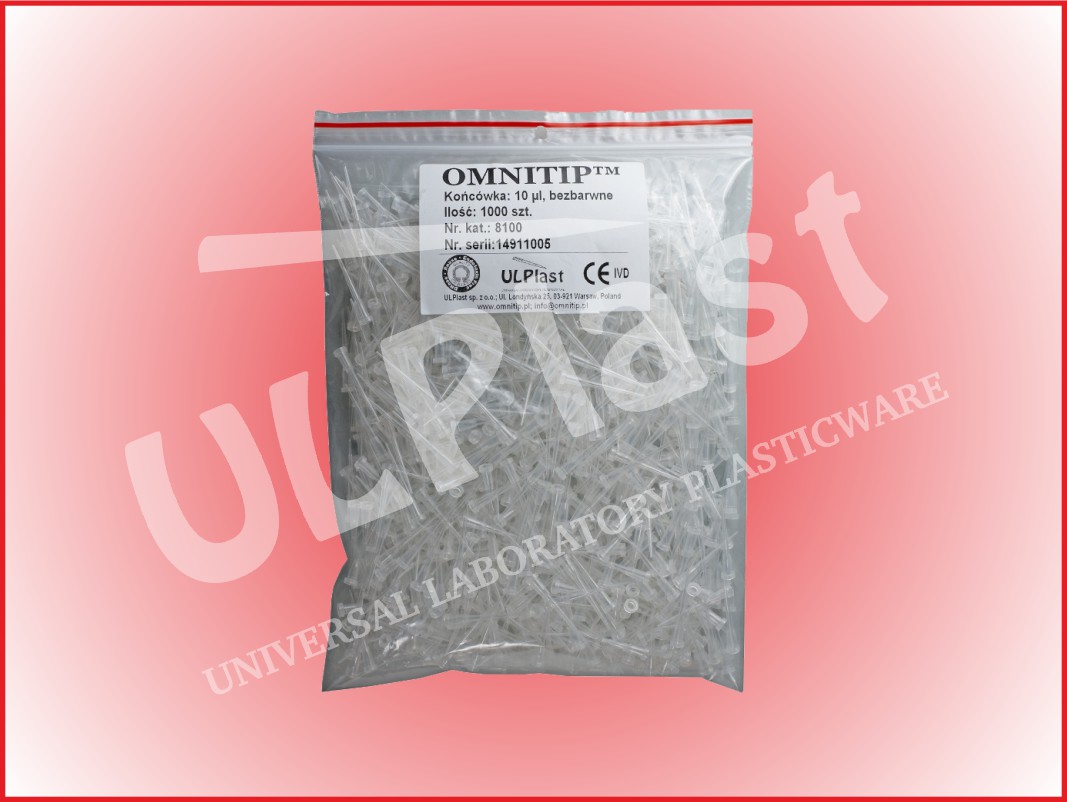 81120 Końcówki OMNITIP® OM-10-F-B-C do pipet, poj. poj. 0,5-10 µl, dł. 38 mm, bezbarwne, z filtrem, pakowane w worku.