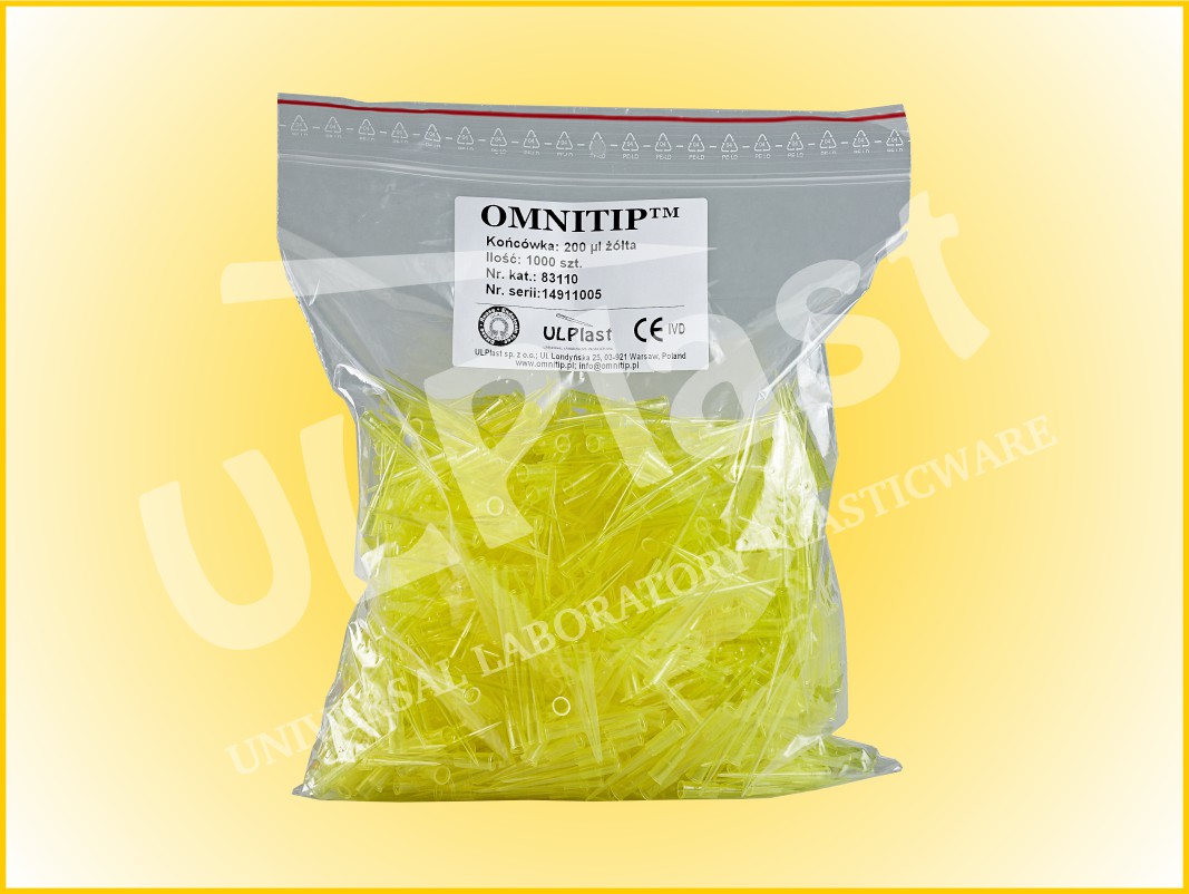 83110 Końcówki OMNITIP® OM-200-B-Y do pipet, poj. 1-200 µl, dł. 49,5 mm, żółte, pakowane w worku.